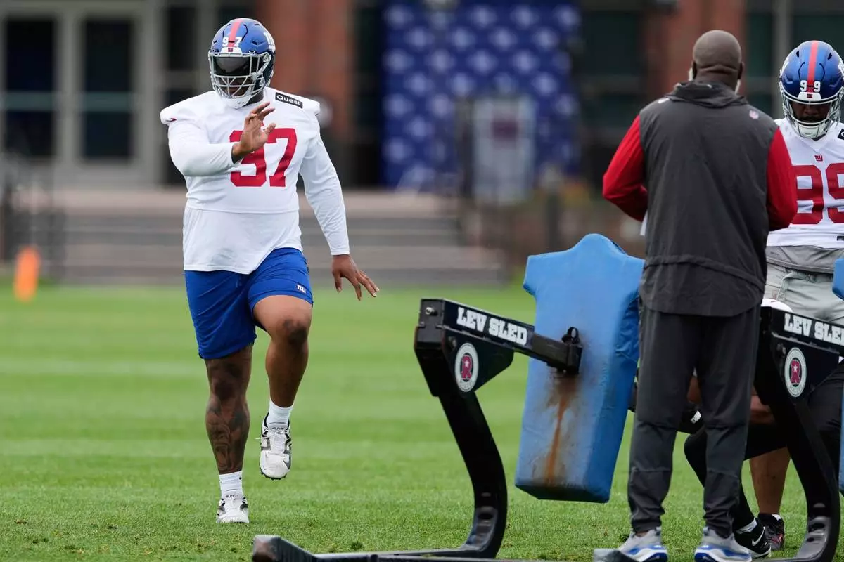 FILE - New York Giants' Dexter Lawrence II participates during an NFL football practice in East Rutherford, N.J., Wednesday, May 28, 2025. (AP Photo/Seth Wenig, File)