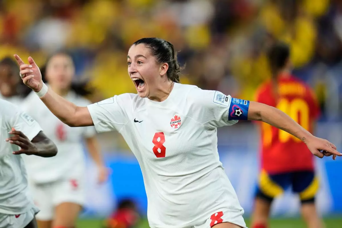 FILE - Canada's Florianne Jourde (8) celebrates her side's opening goal during a U-20 Women's World Cup round of sixteen soccer match against Spain in Cali, Colombia, Wednesday, Sept. 11, 2024. (AP Photo/Dolores Ochoa, File)