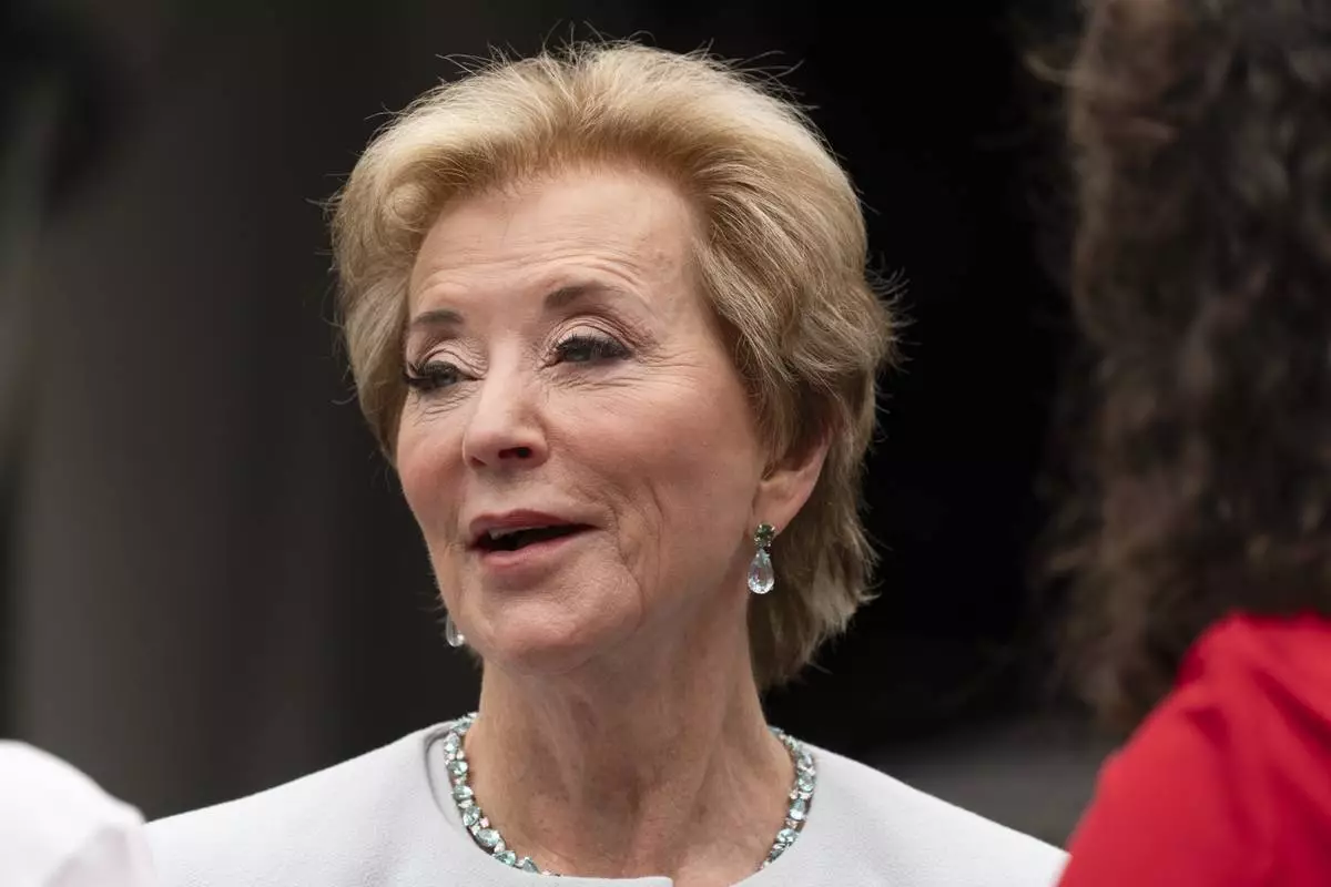 Education Secretary Linda McMahon, talks to her staff as they wait on the North Lawn of the White House for a TV interview, Tuesday, July 15, 2025. (AP Photo/Manuel Balce Ceneta)