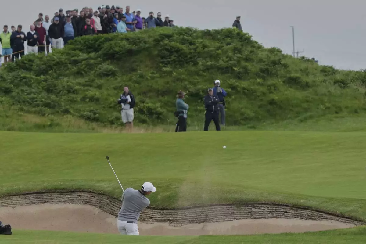 Rory McIlroy of Northern Ireland plays his second shot on12th hole from a bunker during the first round of the British Open golf championship at the Royal Portrush Golf Club, Northern Ireland, Thursday, July 17, 2025. (AP Photo/Jon Super)