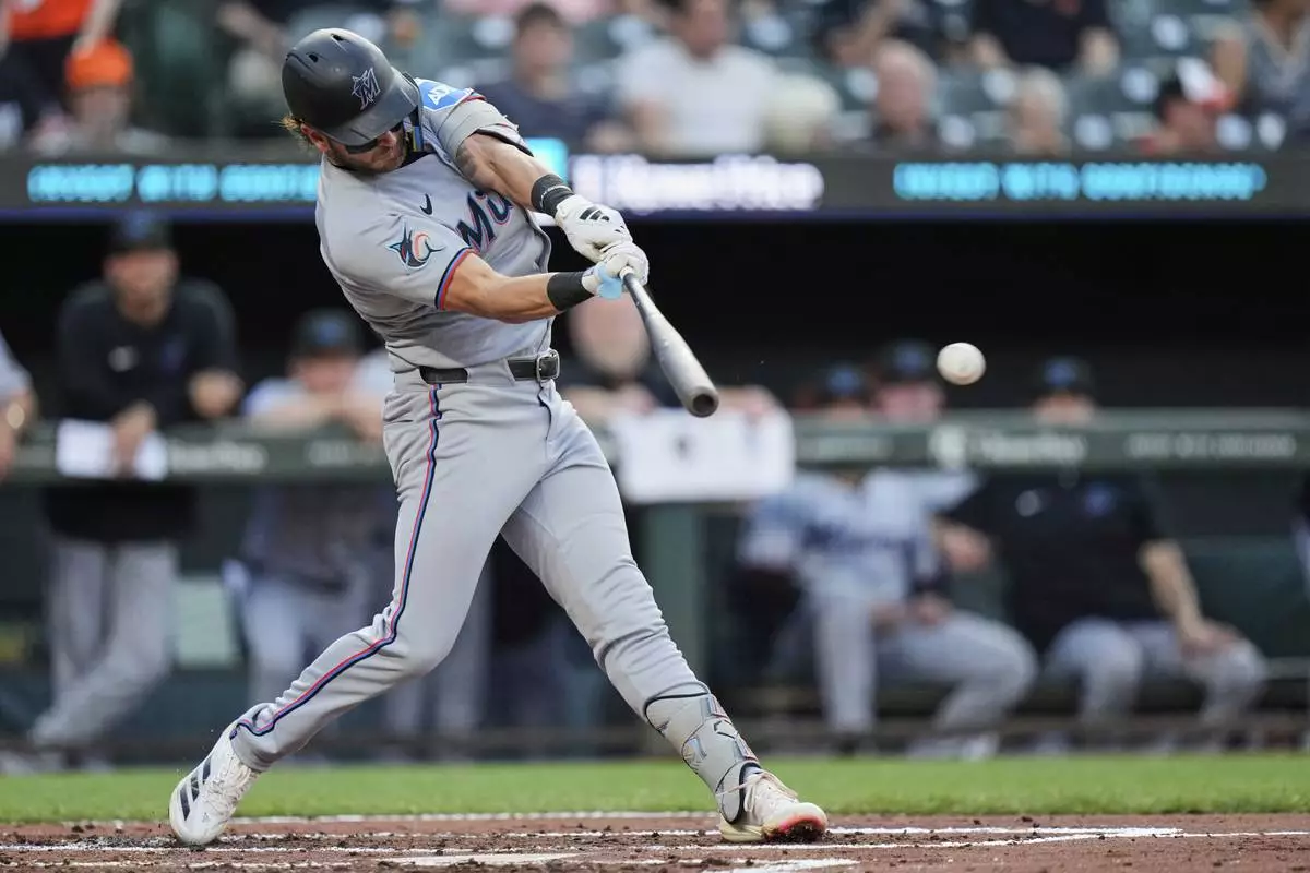 Miami Marlins' Connor Norby hits a single during the third inning of a baseball game against the Baltimore Orioles, Friday, July 11, 2025, in Baltimore. (AP Photo/Stephanie Scarbrough)