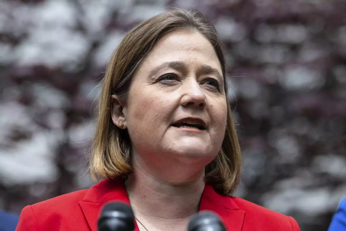 FILE - Iowa Attorney General Brenna Bird speaks at a press conference, May 13, 2024, in New York. (AP Photo/Stefan Jeremiah, File)