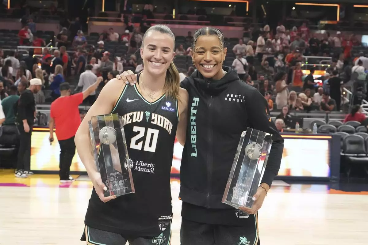 New York Liberty's Sabrina Ionescu, left, holds the 3-point contest trophy while New York Liberty's Natasha Cloud holds the skills challenge trophy during the WNBA All-Star basketball weekend, Friday, July 18, 2025, in Indianapolis. (AP Photo/Michael Conroy)