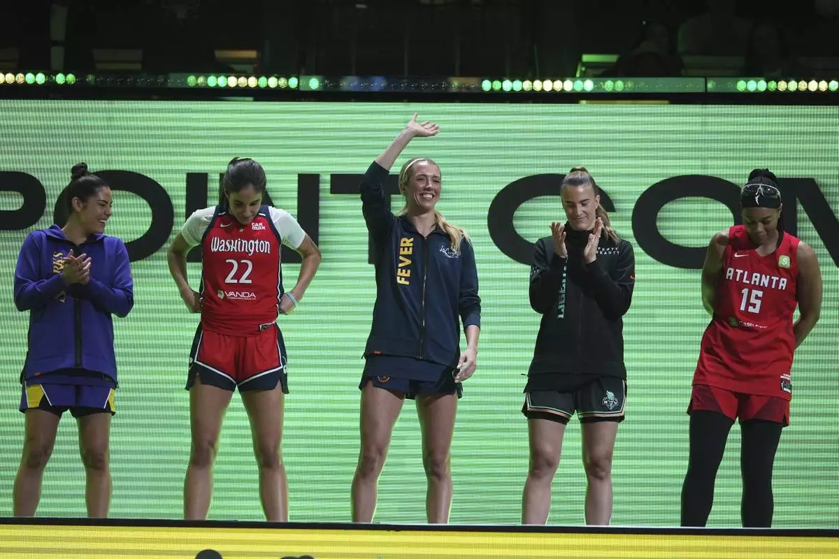 Los Angeles Sparks's Kelsey Plum, from left, Washington Mystics' Sonia Citron, Indiana Fever's Lexi Hull, New York Liberty's Sabrina Ionescu and Atlanta Dream's Allisha Gray are introduced before the 3-point contest at the WNBA All-Star basketball weekend, Friday, July 18, 2025, in Indianapolis. (AP Photo/Michael Conroy)