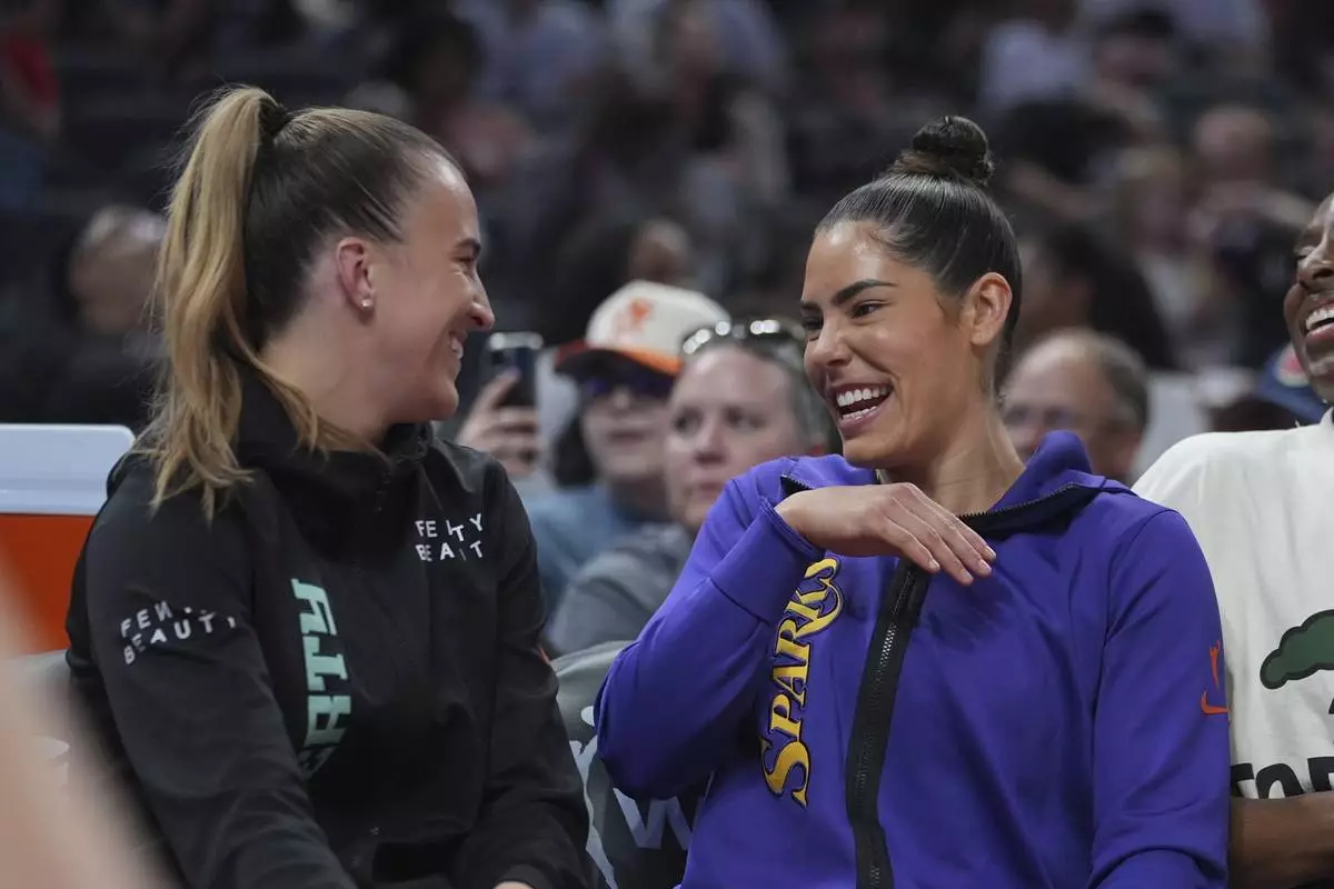 New York Liberty's Sabrina Ionescu, left, jokes with Los Angeles Sparks's Kelsey Plum during the skills challenge at the WNBA All-Star basketball weekend, Friday, July 18, 2025, in Indianapolis. (AP Photo/Michael Conroy)