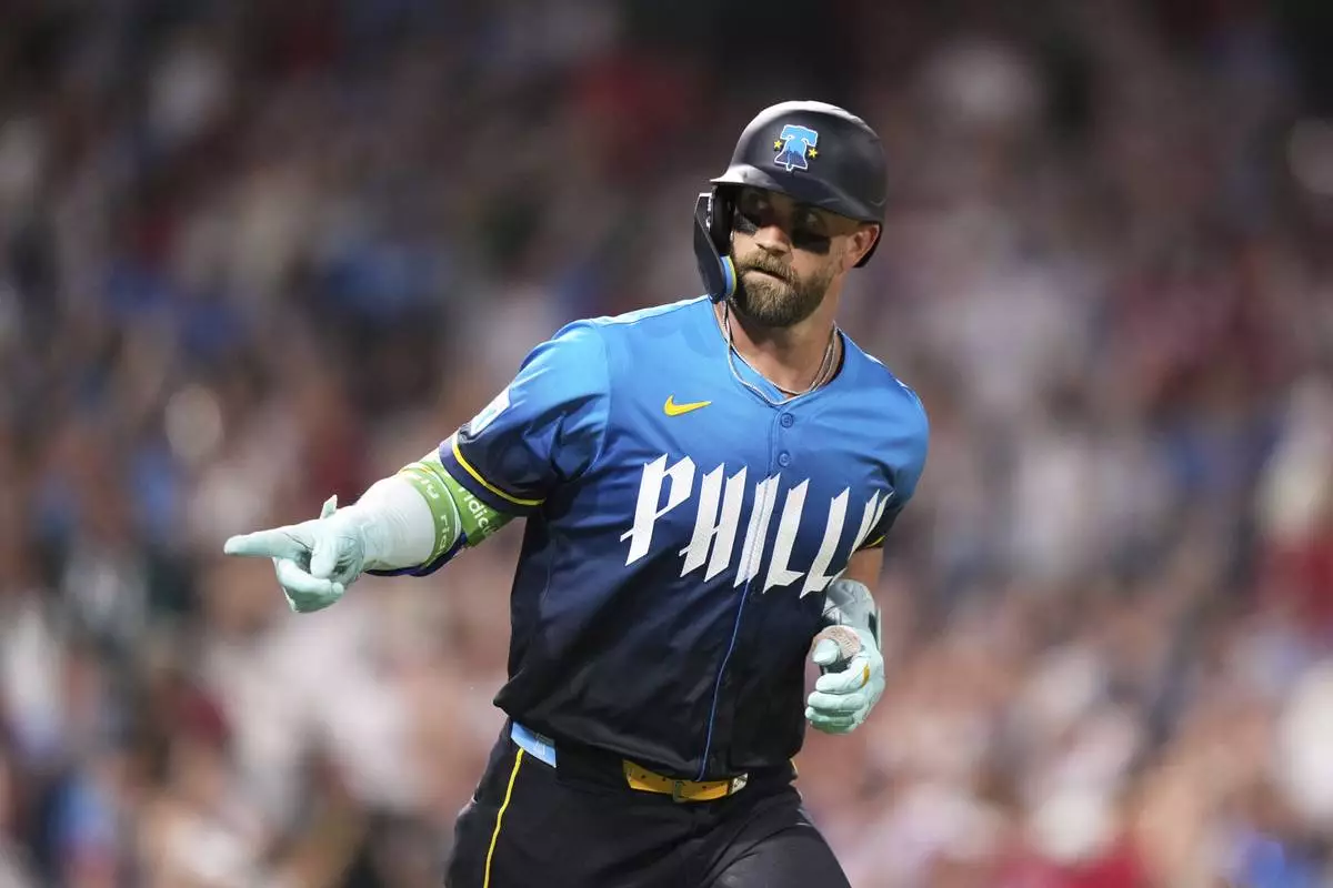 Philadelphia Phillies' Bryce Harper reacts after hitting a home run against Los Angeles Angels pitcher José Fermin during the eighth inning of a baseball game Friday, July 18, 2025, in Philadelphia. (AP Photo/Matt Slocum)