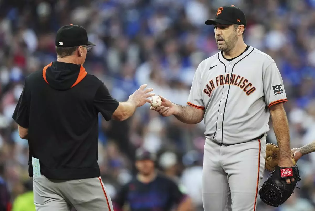 San Francisco Giants pitcher Justin Verlander (35) is taken out of the game by manager Bob Melvin against the Toronto Blue Jays during third inning MLB baseball action in Toronto on Friday, July 18, 2025. (Nathan Denette/The Canadian Press via AP)