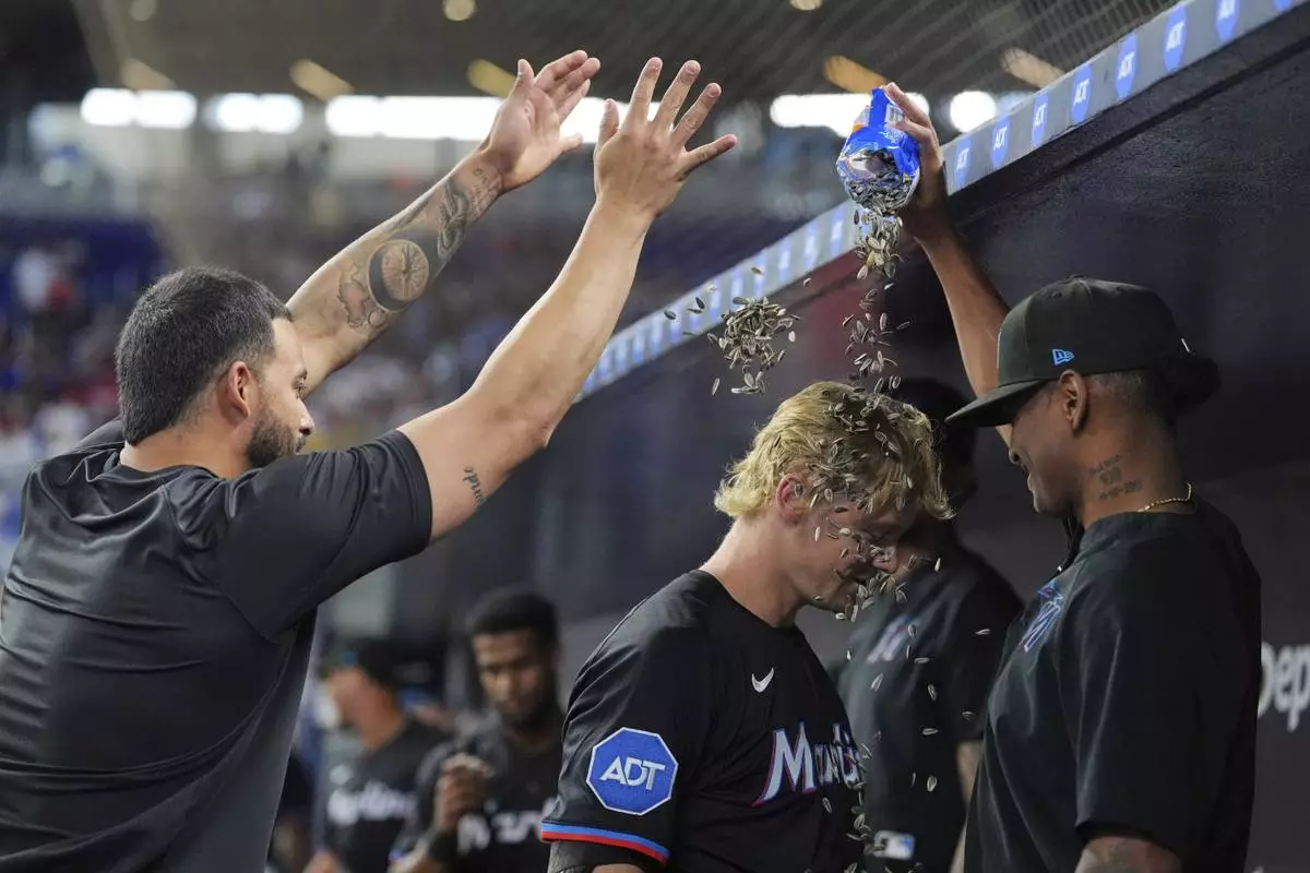 Miami Marlins' Kyle Stowers, center, is celebrated by teammates after hitting a two-run homer in the first inning of a baseball game against the Kansas City Royals, Friday, July 18, 2025, in Miami. (AP Photo/Rebecca Blackwell)