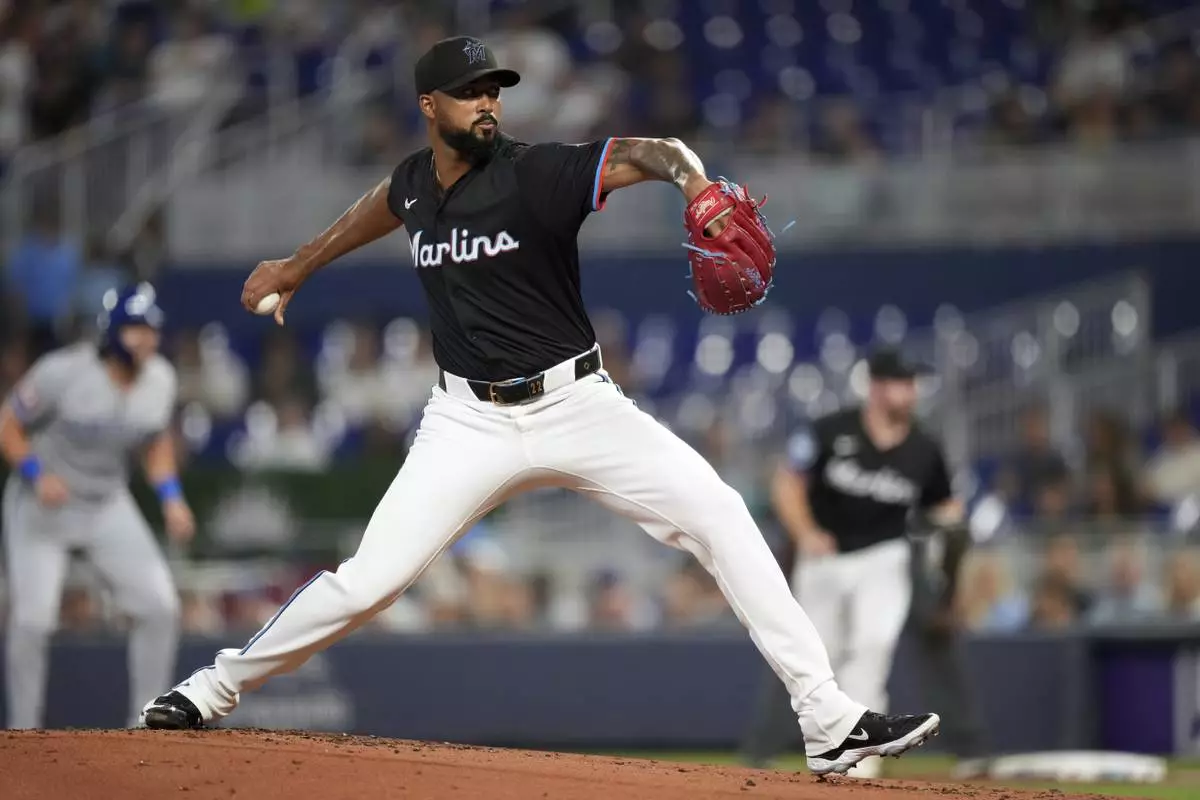 Miami Marlins pitcher Sandy Alcantara pitches during the first inning of a baseball game against the Kansas City Royals, Friday, July 18, 2025, in Miami. (AP Photo/Rebecca Blackwell)