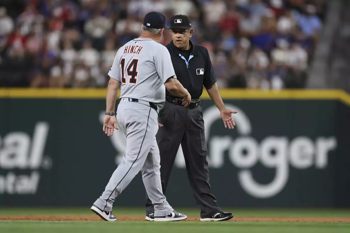 Detroit Tigers manager A.J. Hinch (14) and second base umpire Alfonso Márquez exchange words during the third inning of a baseball game against the Texas Rangers Friday, July 18, 2025, in Arlington, Texas. (AP Photo/Sam Hodde)