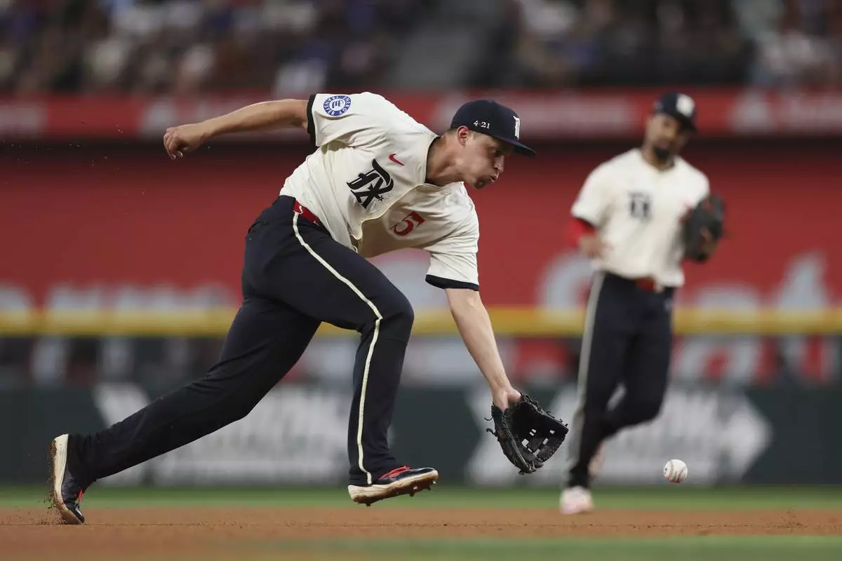 Texas Rangers shortstop Corey Seager (5) fields a ground ball hit by Detroit Tigers' Spencer Torkelson during the fourth inning of a baseball game on Friday, July 18, 2025, in Arlington, Texas. (AP Photo/Sam Hodde)