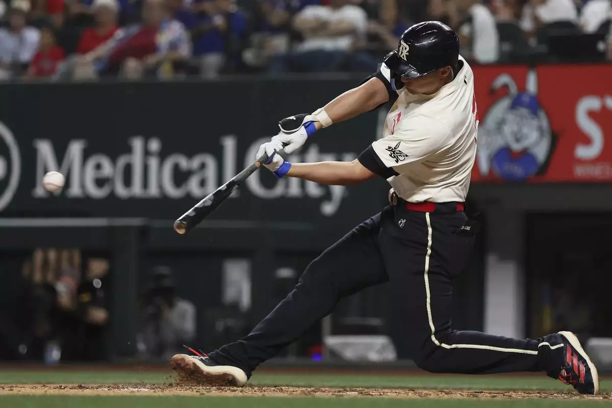 Texas Rangers' Corey Seager hits a two RBI double during the eighth inning of a baseball game against the Detroit Tigers on Friday, July 18, 2025, in Arlington, Texas. (AP Photo/Sam Hodde)