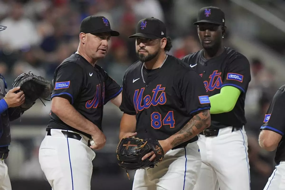 New York Mets manager Carlos Mendoza, left, takes New York Mets pitcher Alex Carrillo, center, out of the game during the sixth inning of a baseball game against the Cincinnati Reds Friday, July 18, 2025, in New York. (AP Photo/Frank Franklin II)