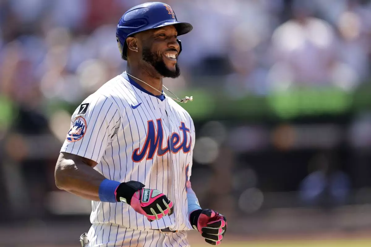 New York Mets' Starling Marte reacts after flying out to end the sixth inning of a baseball game against the New York Yankees, Sunday, July 6, 2025, in New York. (AP Photo/Adam Hunger)