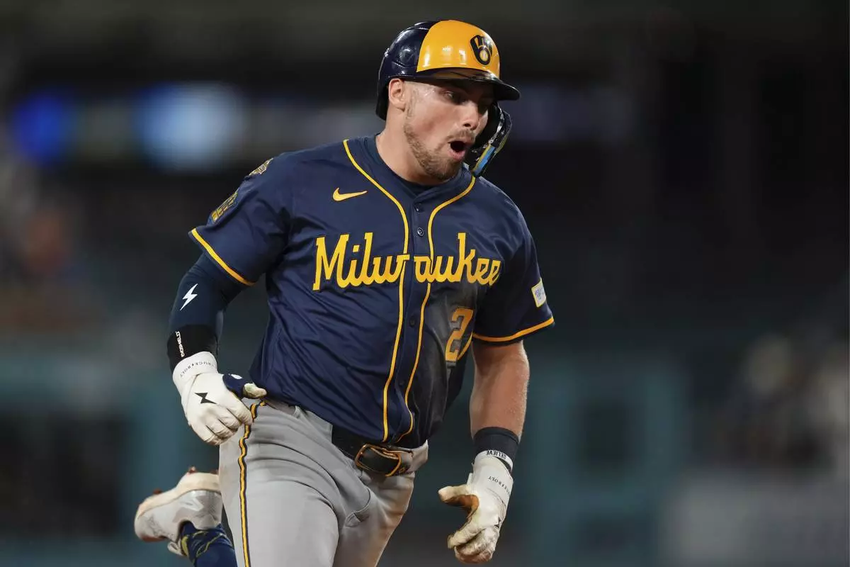 Milwaukee Brewers' Caleb Durbin celebrates as he rounds third after hitting a solo home run during the seventh inning of a baseball game against the Los Angeles Dodgers, Friday, July 18, 2025, in Los Angeles. (AP Photo/Mark J. Terrill)