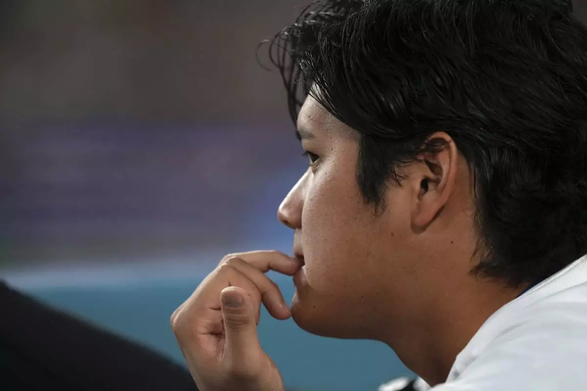 Los Angeles Dodgers' Shohei Ohtani watches from the dugout during the fourth inning of a baseball game against the Milwaukee Brewers, Friday, July 18, 2025, in Los Angeles. (AP Photo/Mark J. Terrill)