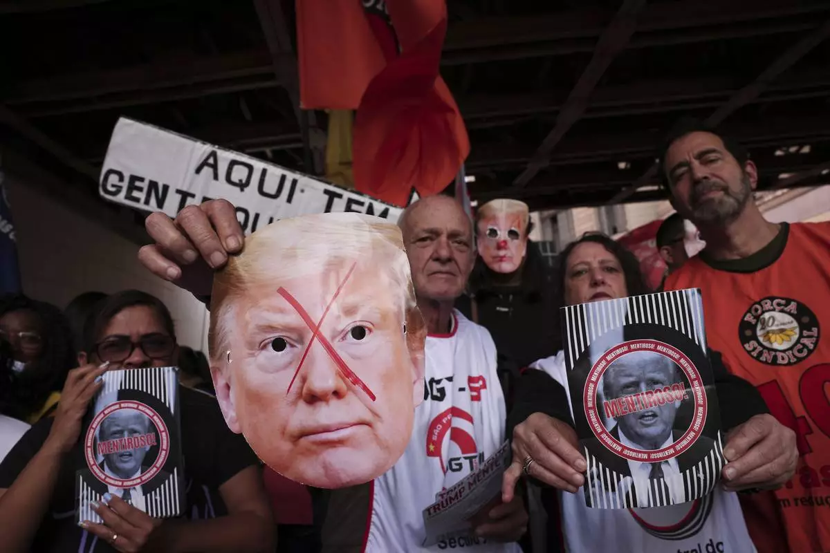 Demonstrators protest U.S. President Donald Trump's announcement of 50% tariffs on Brazilian goods and against U.S. report that cited counterfeit product sales in Brazil, in Sao Paulo, Friday, July 18, 2025. (AP Photo/Ettore Chiereguini)