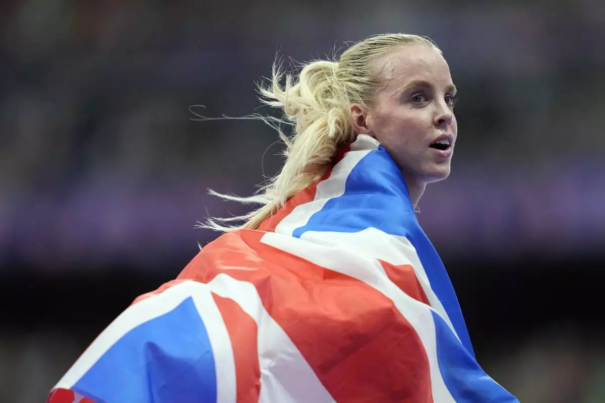 FILE - Keely Hodgkinson, of Britain, celebrates after winning the gold medal in the women's 800 meters final at the 2024 Summer Olympics, Aug. 5, 2024, in Saint-Denis, France. (AP Photo/Ashley Landis, File)