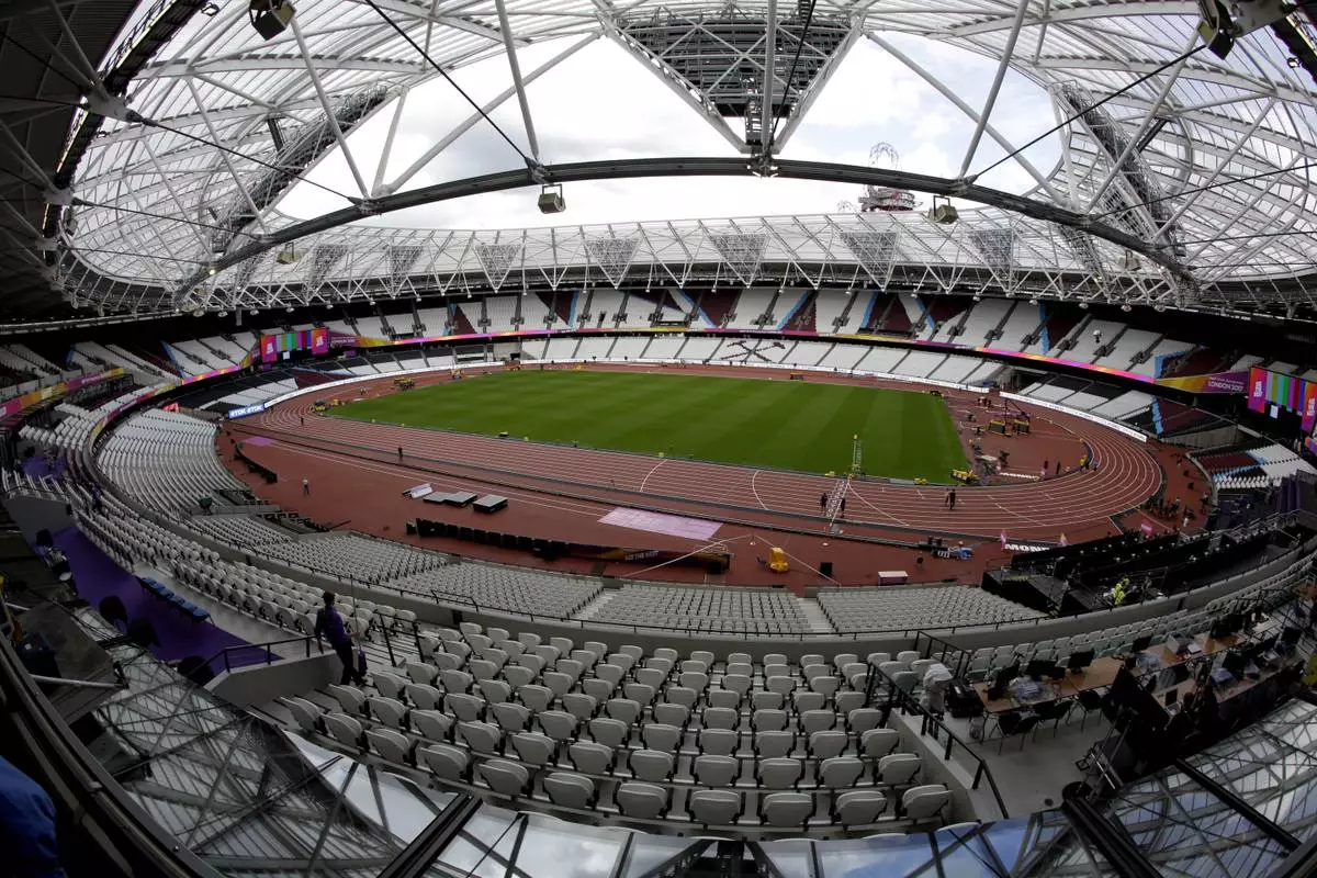 FILE -Workers continue setup preparations ahead of the start of the World Athletics Championships at the London Stadium, in the Queen Elizabeth Olympic Park in London, Aug. 1, 2017. (AP Photo/Matt Dunham, File)