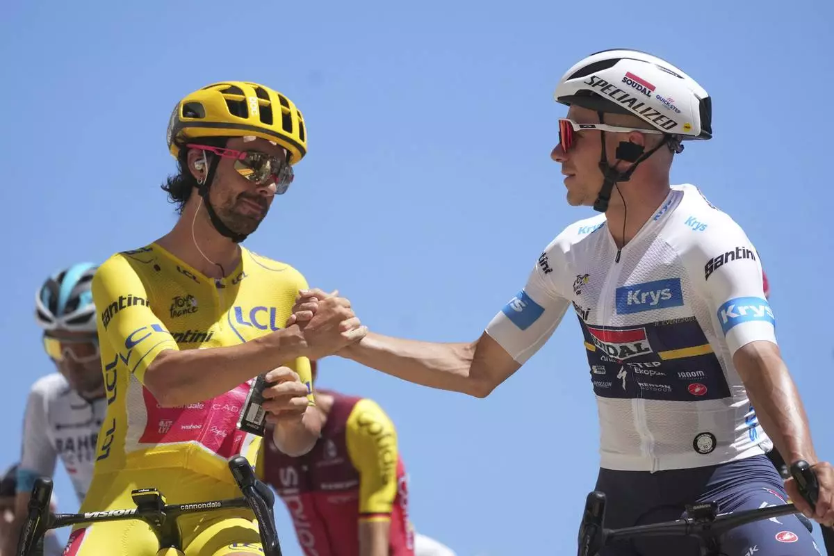 Ireland's Ben Healy, wearing the overall leader's yellow jersey, and Belgium's Remco Evenepoel, wearing the best young rider's white jersey, greet before the twelfth stage of the Tour de France cycling race over 180.6 kilometers (112.2 miles) with start in Auch and finish in Hautacam, France, Thursday, July 17, 2025. (AP Photo/Thibault Camus)