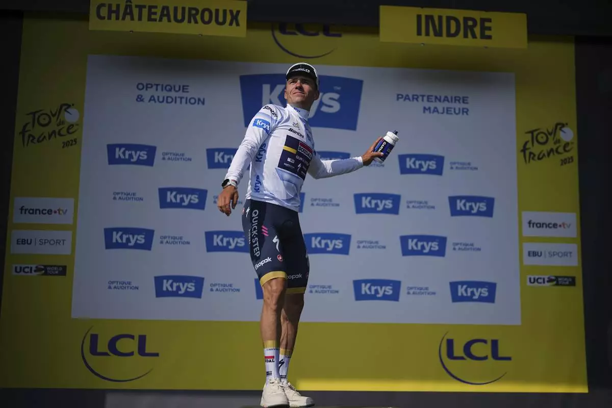 Belgium's Remco Evenepoel, wearing the best young rider's white jersey, celebrates on the podium after the ninth stage of the Tour de France cycling race over 174.1 kilometers (108 miles) with start in Chinon and finish in Chateauroux, France, Sunday, July 13, 2025. (AP Photo/Thibault Camus)