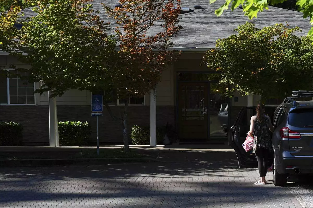 A guardian drops off a child at the Guidepost Montessori school on Friday, July 18, 2025, in Beaverton, Ore. (AP Photo/Jenny Kane)