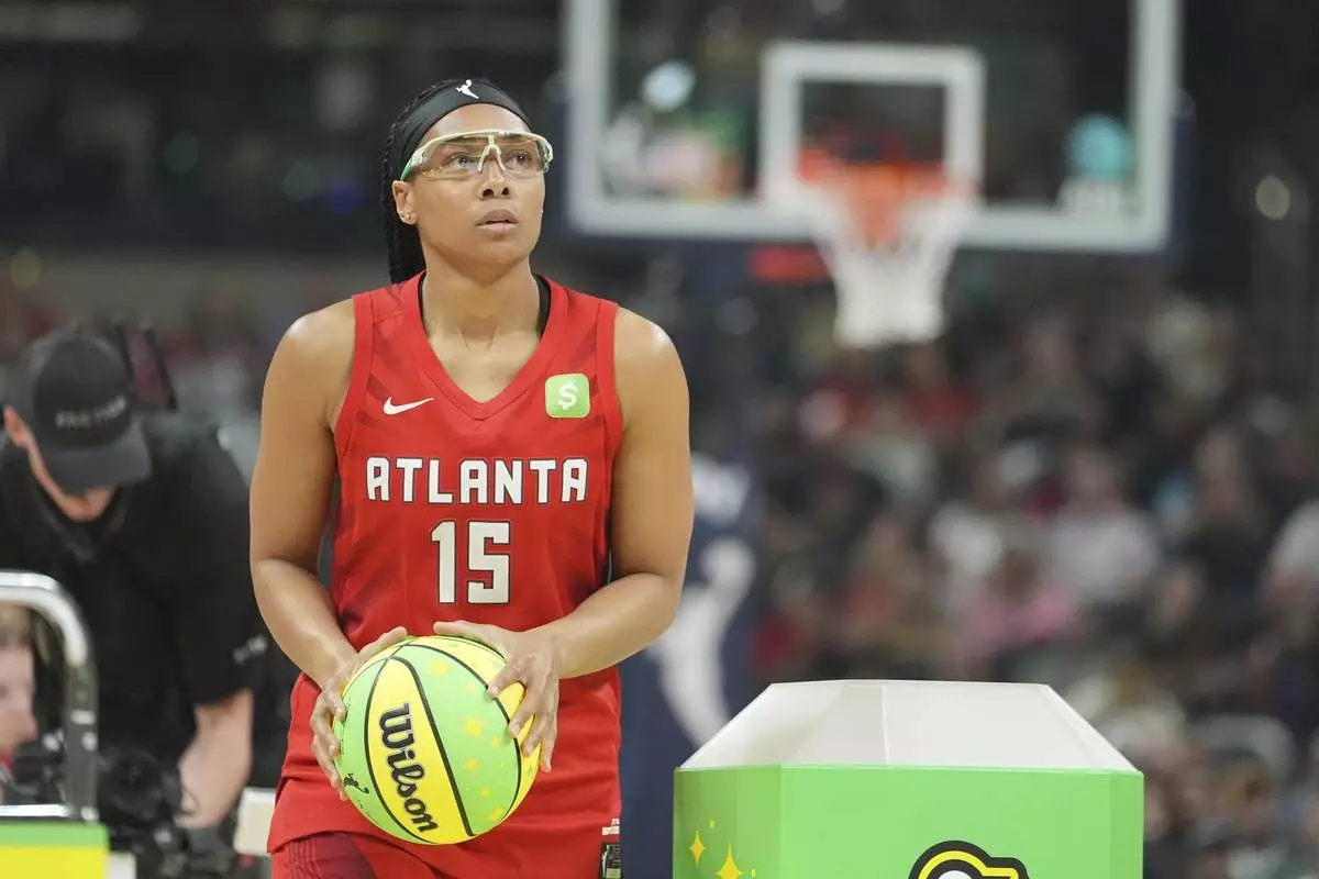 Atlanta Dream's Allisha Gray shoots during the 3-point contest at the WNBA All-Star basketball weekend, Friday, July 18, 2025, in Indianapolis. (AP Photo/Michael Conroy)