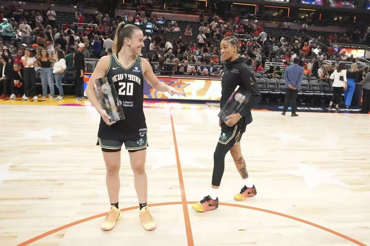 New York Liberty's Sabrina Ionescu, left, holds the 3-point contest trophy while New York Liberty's Natasha Cloud holds the skills challenge trophy during the WNBA All-Star basketball weekend, Friday, July 18, 2025, in Indianapolis. (AP Photo/Michael Conroy)