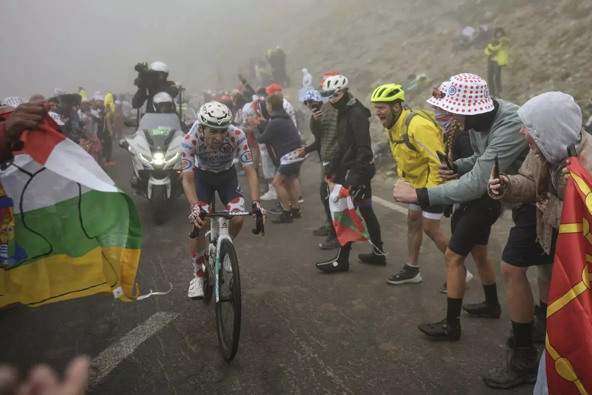 France's Lenny Martinez, wearing the best climber's dotted jersey, climbs Tourmalet pass in the fog during the fourteenth stage of the Tour de France cycling race over 182.6 kilometers (113.5 miles) with start in Pau and finish in Luchon Superbagneres, France, Saturday, July 19, 2025. (AP Photo/Thibault Camus)