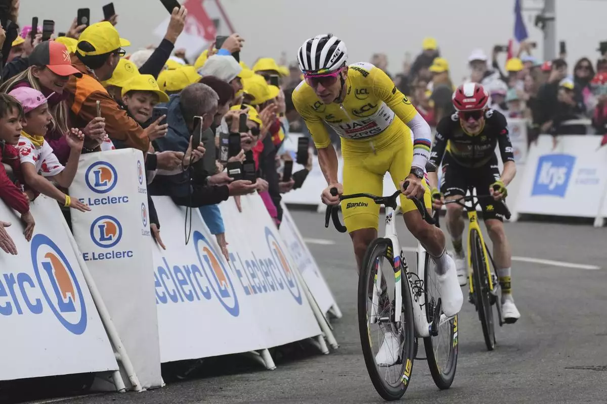 Denmark's Jonas Vingegaard, rear, and Slovenia's Tadej Pogacar, wearing the overall leader's yellow jersey, ride in the final climb during the fourteenth stage of the Tour de France cycling race over 182.6 kilometers (113.5 miles) with start in Pau and finish in Luchon Superbagneres, France, Saturday, July 19, 2025. (AP Photo/Thibault Camus)