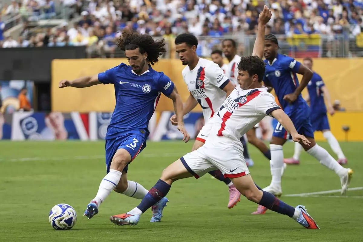 Chelsea's Marc Cucurella and Paris Saint-Germain's Joao Neves vie for control of the ball during the second half of the Club World Cup final soccer match in East Rutherford, N.J., Sunday, July 13, 2025. (AP Photo/Frank Franklin II)