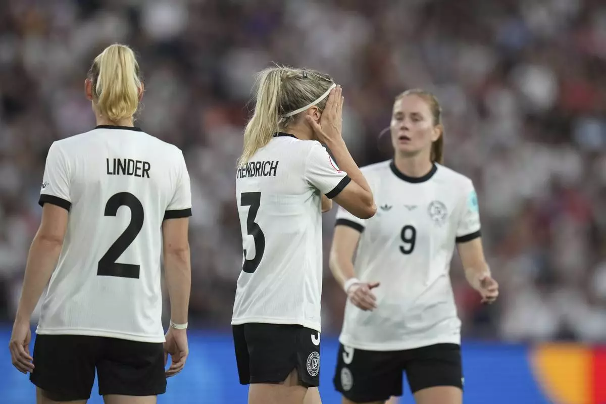Germany's Kathrin Hendrich reacts after seeing a red card for pulling the hair of France's Griedge Mbock Bathy during the Women's Euro 2025 quarterfinals soccer match between France and Germany at St. Jakob-Park in Basel, Switzerland, Saturday, July 19, 2025. (AP Photo/Alessandra Tarantino)