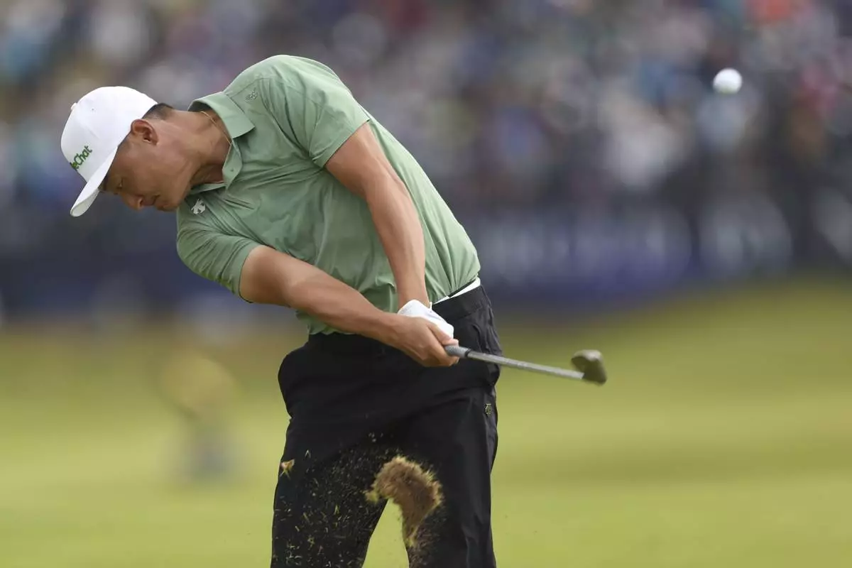 Li Haotong of China plays his shot on the 15th fairway during the second round of the British Open golf championship at the Royal Portrush Golf Club, Northern Ireland, Friday, July 18, 2025. (AP Photo/Peter Morrison)
