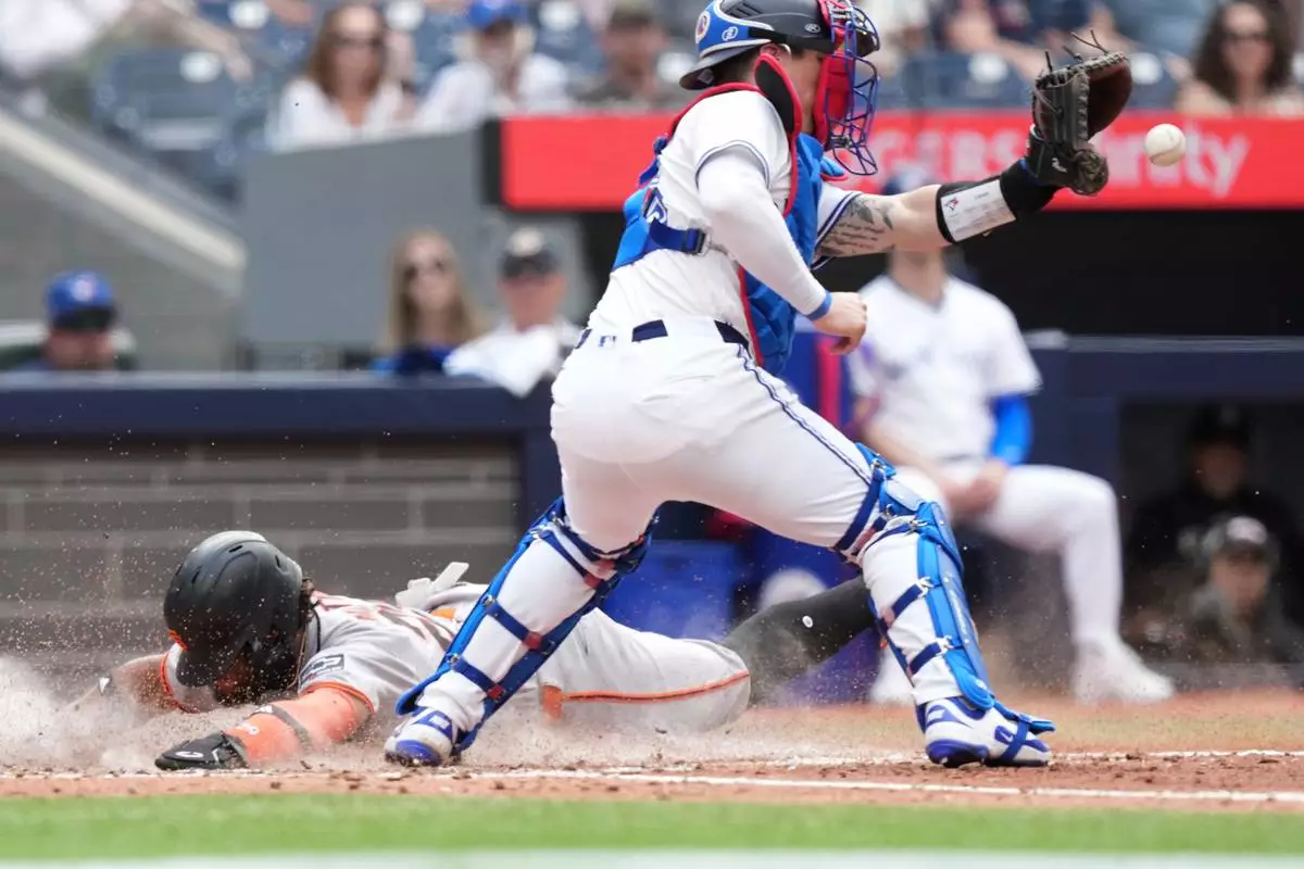 San Francisco Giants outfielder Luis Matos (29) is safe at home plate pass Toronto Blue Jays catcher Tyler Heineman (55) during sixth inning MLB action in Toronto on Saturday, July 19, 2025. (Nathan Denette/The Canadian Press via AP)