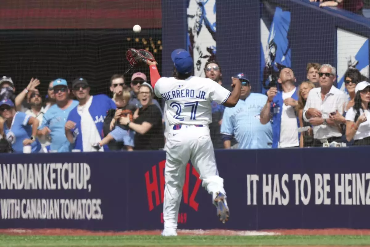 Toronto Blue Jays first base Vladimir Guerrero Jr. (27) makes a running catch during fourth inning MLB baseball action against the San Francisco Giants in Toronto on Saturday, July 19, 2025. (Nathan Denette/The Canadian Press via AP)