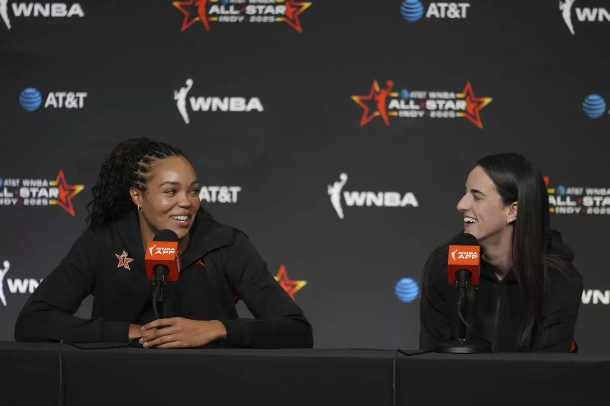 Minnesota Lynx's Napheesa Collier, left, and Indiana Fever's Caitlin Clark, right, speak during a news conference before the WNBA All-Star basketball game Saturday, July 19, 2025, in Indianapolis. (AP Photo/Michael Conroy)