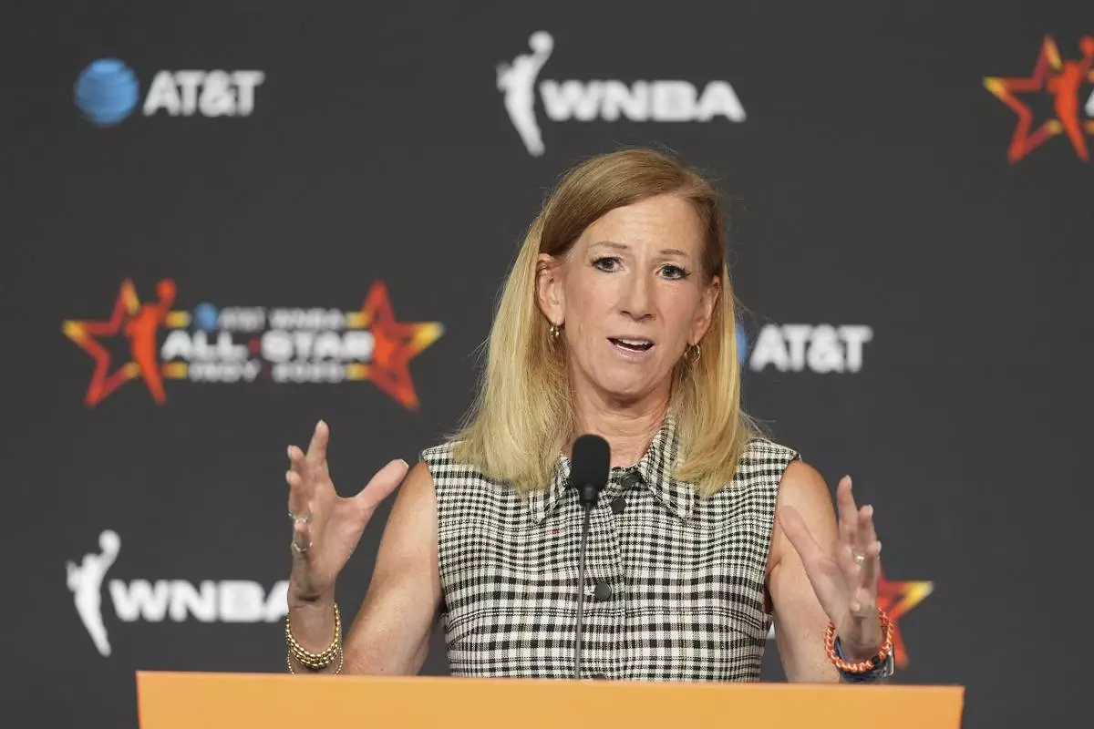 WNBA Commissioner Cathy Engelbert speaks during a news conference before the WNBA All-Star basketball game, Saturday, July 19, 2025, in Indianapolis. (AP Photo/Michael Conroy)
