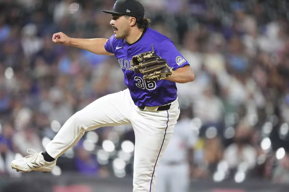 Colorado Rockies relief pitcher Zach Agnos works against the Minnesota Twins in the ninth inning of a baseball game Saturday, July 19, 2025, in Denver. (AP Photo/David Zalubowski)