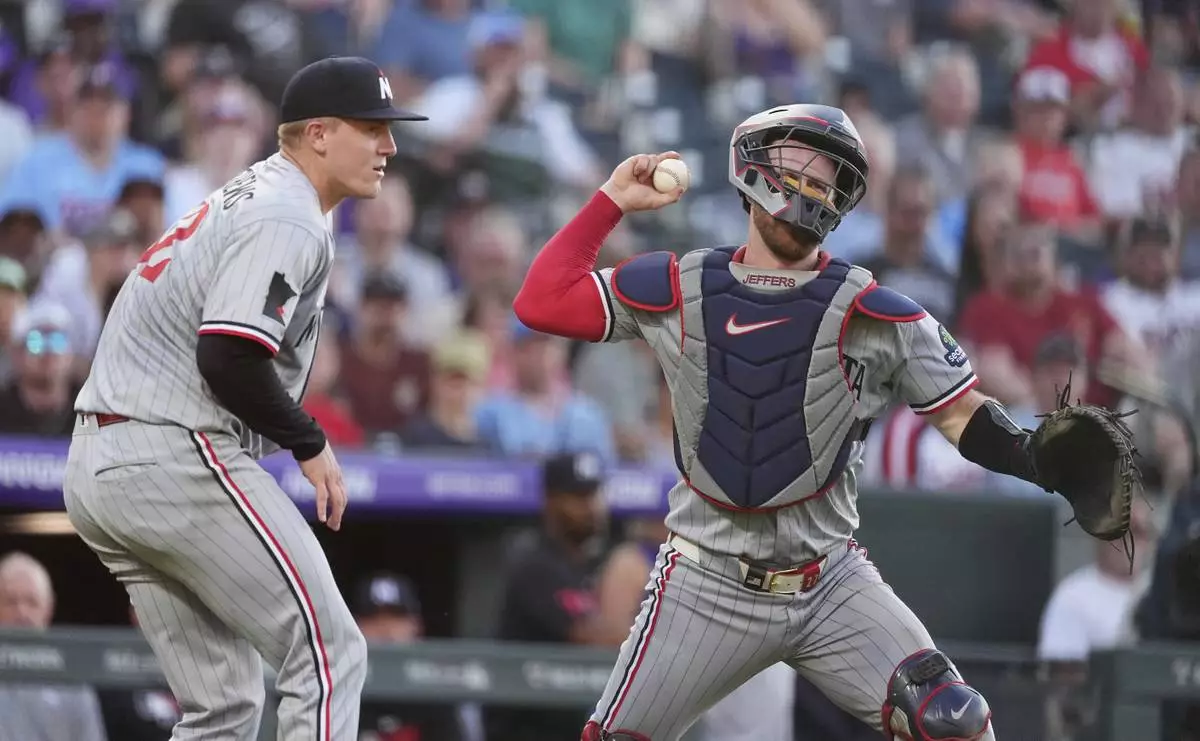 Minnesota Twins catcher Ryan Jeffers, right, looks to throw the ball to first base after fielding an infield single off the bat of Colorado Rockies' Jordan Beck as Twins starting pitcher Zebby Matthews, left, looks on in the third inning of a baseball game Saturday, July 19, 2025, in Denver. (AP Photo/David Zalubowski)