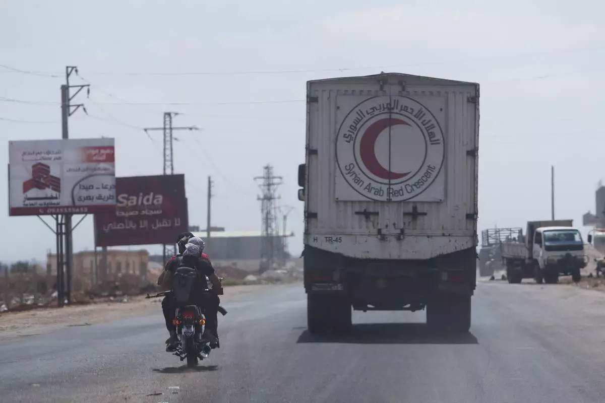 Fighters ride a motorcycle past a convoy of vehicles loaded with food and other aid en route to Sweida on the international highway in rural Daraa province, Syria, Sunday, July 20, 2025, heading to the city of Busra al-Sham. (AP Photo/Omar Sanadiki)