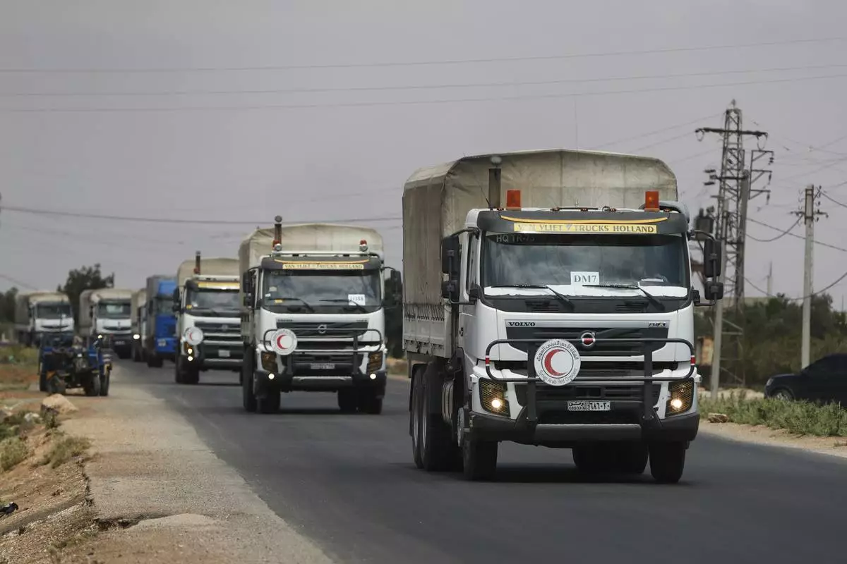 A convoy of vehicles loaded with food and other aid is en route to Sweida on the international highway in rural Daraa province, Syria, Sunday, July 20, 2025, heading to the city of Busra al-Sham. (AP Photo/Omar Sanadiki)