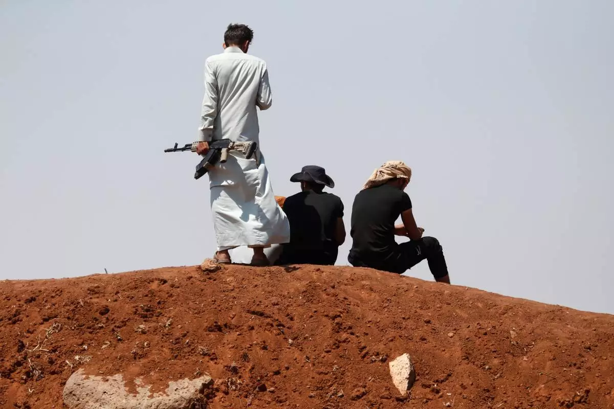Syrian government security forces block Bedouin fighters, background, from entering Sweida province, in Busra al-Harir village, southern Syria, Sunday, July 20, 2025. (AP Photo/Omar Sanadiki)