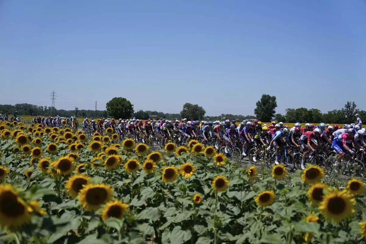 The pack rides past a field of sunflowers during the eleventh stage of the Tour de France cycling race over 156.8 kilometers (97.4 miles) with start and finish in Toulouse, France, Wednesday, July 16, 2025. (AP Photo/Mosa'ab Elshamy)
