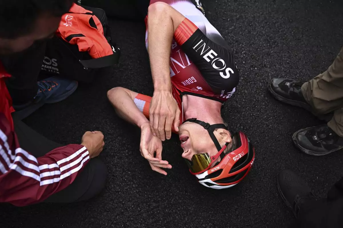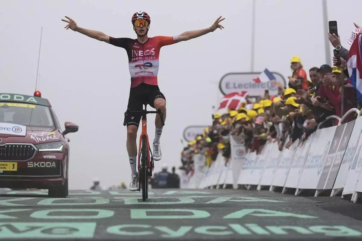 Stage winner Netherlands' Thymen Arensman reacts after the fourteenth stage of the Tour de France cycling race over 182.6 kilometers (113.5 miles) with start in Pau and finish in Luchon Superbagneres, France, Saturday, July 19, 2025. (Loic Venance/Pool Photo via AP)