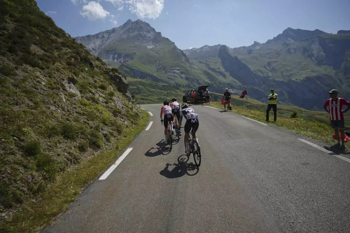 Riders climbs Col du Soulor pass during the twelfth stage of the Tour de France cycling race over 180.6 kilometers (112.2 miles) with start in Auch and finish in Hautacam, France, Thursday, July 17, 2025. (AP Photo/Thibault Camus)
