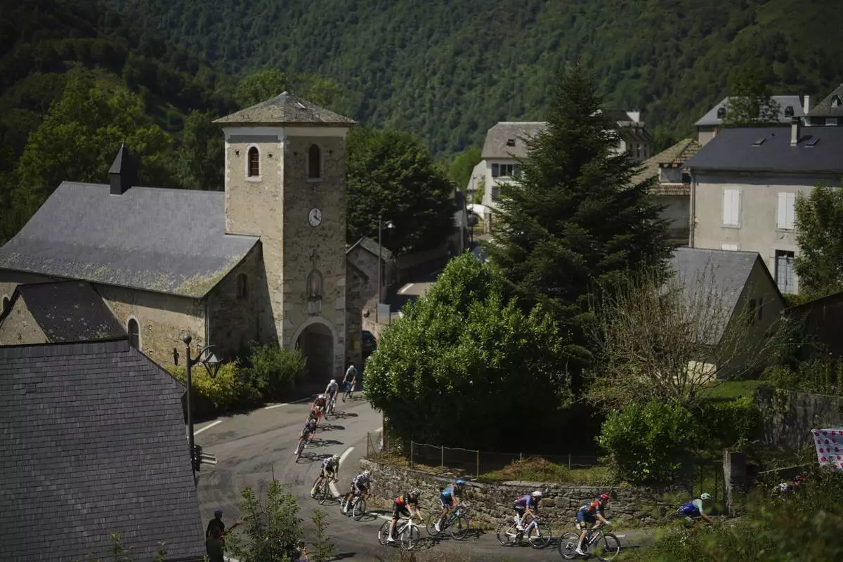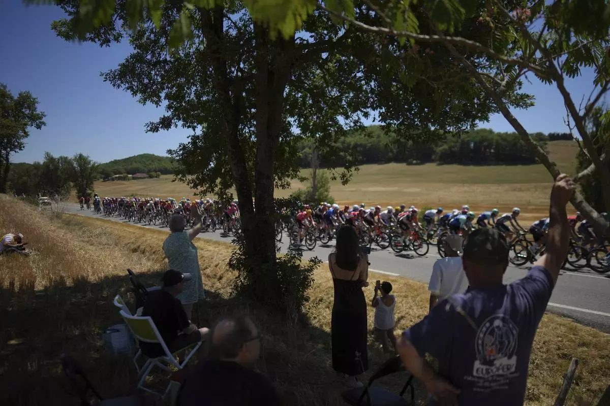 Spectators watch the pack during the twelfth stage of the Tour de France cycling race over 180.6 kilometers (112.2 miles) with start in Auch and finish in Hautacam, France, Thursday, July 17, 2025. (AP Photo/Thibault Camus)