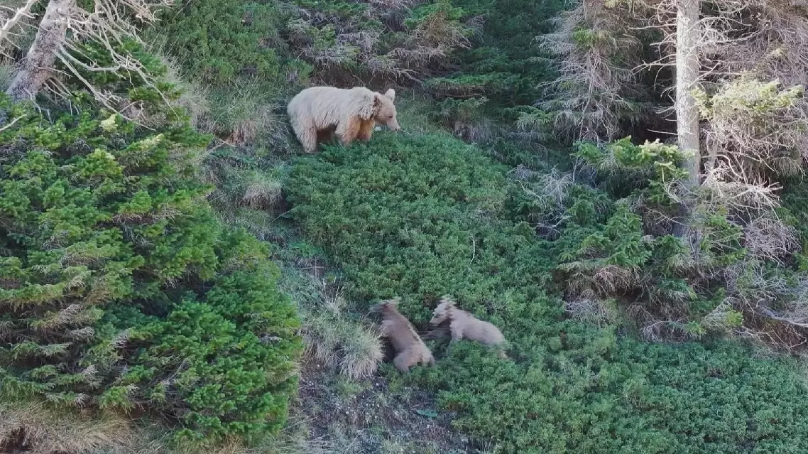 The white-furred female bear shook head, then turned urgently to check on her cinnamon cubs. After regrouping, the female bear led them through bushes before scaling cliffs with astonishing ease along narrow paths.