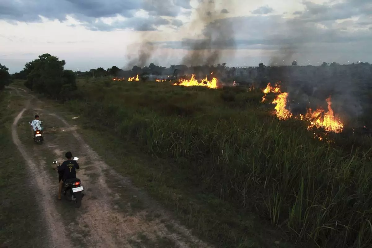 Motorists ride past a fire that razes through a peatland field in Ogan Ilir, South Sumatra, Indonesia, Sunday, July 20, 2025. (AP Photo/Muhammad Hatta)