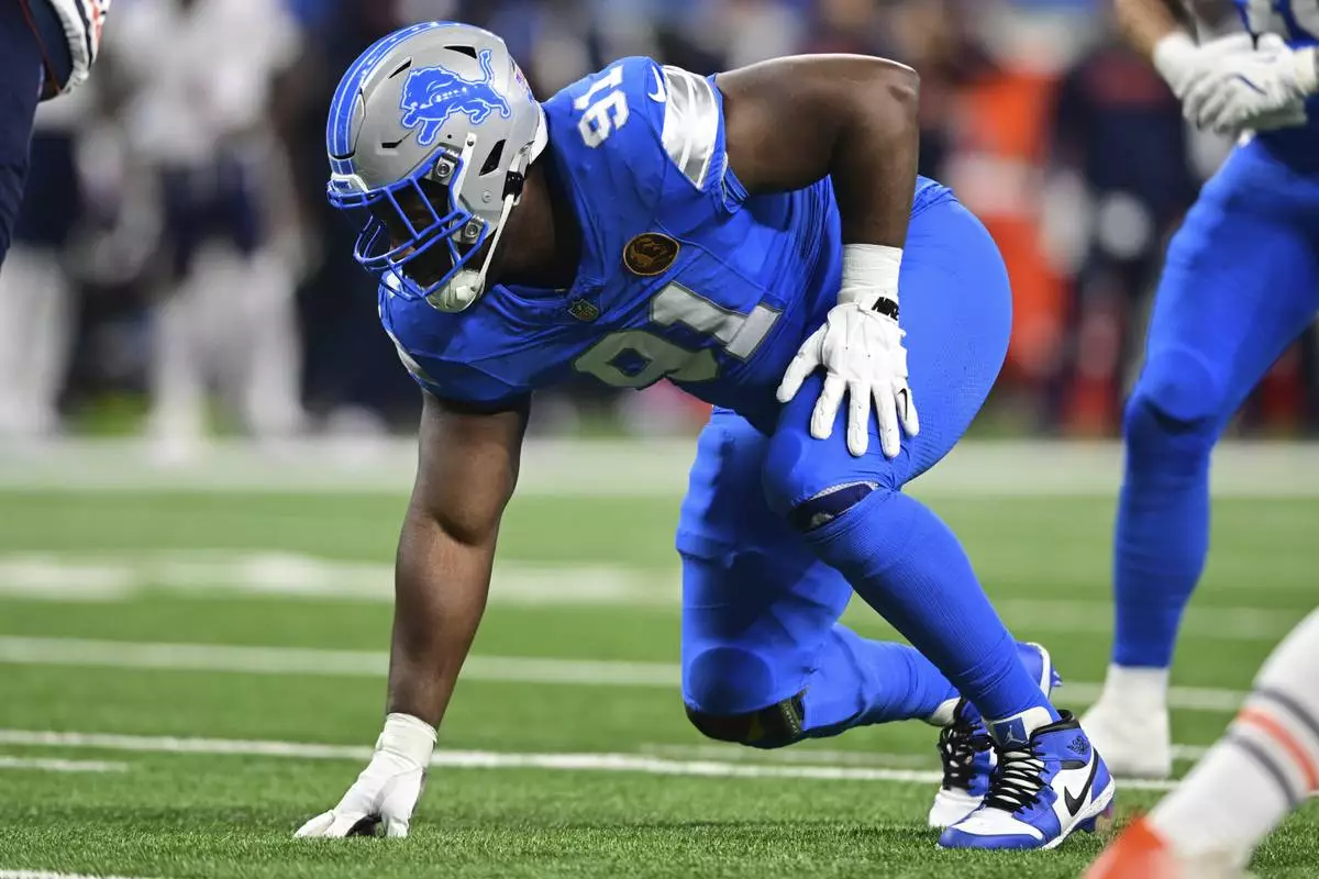 FILE - Detroit Lions defensive end Levi Onwuzurike waits for the snap of the ball during the first half of an NFL football game against the Chicago Bears in Detroit, Nov. 28, 2024. (AP Photo/David Dermer, file)