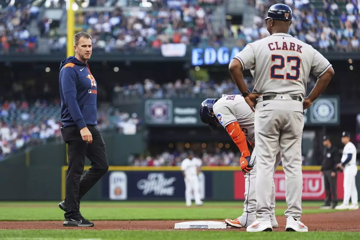 Houston Astros' Isaac Paredes, back right, bends down with an apparent injury at first base as a trainer and first base coach Dave Clark (23) look on during the third inning of a baseball game against the Seattle Mariners, Saturday, July 19, 2025, in Seattle. (AP Photo/Lindsey Wasson)